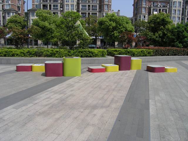 3、整体动漫展区设计与实际环境相协调,主广场以10m×10m大圆造型与周边雕塑底座相协调。次广场以8m×4m的 10组圆圈空间为造型,采用了6种不同颜色组合而成,形成10张不同大小床,造成浪漫的情调色彩,供市民休息作画(见图2《床》),因周边广场凹凸绿地和铺地都以直线为主,而且展示设计为圆造型为主,为营造展览气氛,我们还设计几幅宣传旗,目的是填补高空造型的缺陷。在设计中我们考虑到广场行人多的特点,展示版画不超过80cm,预防事故发生。其他两组方案我们以六边形、圆角、正方形为主,投入在广场绿化边,以强烈色彩与背后单一的绿化色调形成对比,增加广场的动漫展示效果。