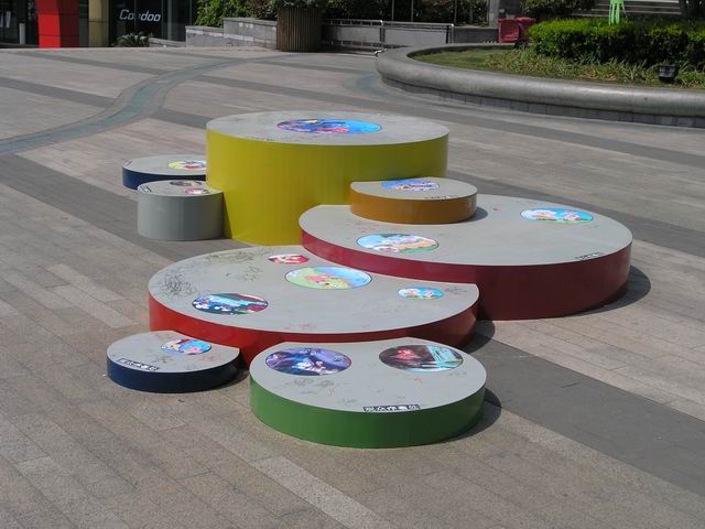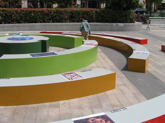 这次杭州西城广场动漫展示设计,我们成功地运用了公共艺术景观造型的设计原理,在造型上与周边环境(圆型雕塑底座)相协调,形态上以儿童喜闻乐见的“迷宫”形式为原型(高70cm,圆直径10cm):分四圈,再一圈尺寸、色彩都不一样(第一圈为20cm,第二圈为30cm,第三圈为40cm,第五圈为50cm)每圈相应错开,高空圆形与低层圆形相呼应,让观众走进艺术展示中心,参观我院动画系学生优秀作业,并可在“观众作画处”自行绘画。色彩上以强烈的颜色(红、黄、绿)等带给观众鲜明感的心理刺激和视觉感受(见图7《迷宫》)。