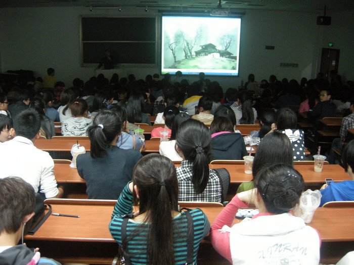 蒋跃教授以饱满的热情和耐心细致的学术态度为师生详细分析了诸多水彩方面的专业知识及水彩的发展历史,对水彩在各专业设计中的运用与表现技法进行了深入的讲解,蒋跃教授还就自己代表性作品的创作初衷、构思过程和表现技法做了细致的介绍分析,放映了尽10年来写生、创作的大量的优秀作品。结合旅欧新作还把当地的风土人情一一介绍给大家。在互动环节认真回答了现场学生的提问,现场气氛热烈,充满了欢笑与掌声,由于座位有限,部分同学站着听完了近两个半小时的讲座。讲座丰富了大家的水彩知识,提高了同学的们艺术修养。
