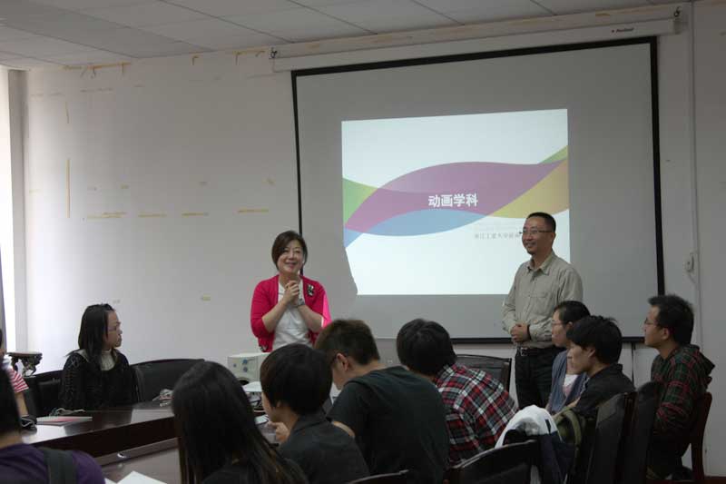动画系徐育忠主任向台南艺术大学的师生们介绍了艺术学院及动画系的基本情况,并播放了动画系师生的作品。台南艺术大学张瑀真教授表达了对常虹院长和徐主任的感谢,并介绍了台南艺术大学音乐工程系的情况,希望今后能与我院进行音乐制作、音乐管理和音乐工程策划方面的合作。