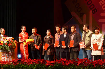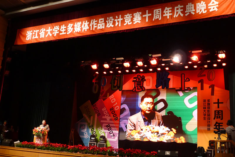 2011年11月17日晚上,为纪念多媒体大赛十周年,省教育厅大赛委员会在浙师大举办大赛十周年庆典晚会,表彰十年来为设计教育事业辛勤付出的教育工作者。我系师生在前九届中获得了优异的成绩,共获得8届一等奖,二、三等奖无数。视传系林曦老师在本次庆典中获得表彰,荣获浙江省大学生多媒体设计大赛十周年优秀指导教师称号。