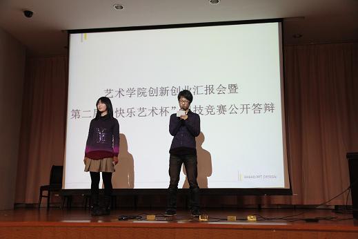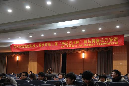 2011年11月30日晚18点半,艺术学院创新创业汇报会暨第二届“快乐艺术杯”科技竞赛公开答辩会在我校屏峰校区健B二楼报告厅举行,环艺系主任陈炜老师、视传系林曦老师、工业设计研究所副所长徐冰老师、学工办施仁江老师作为评委老师参加汇报会。