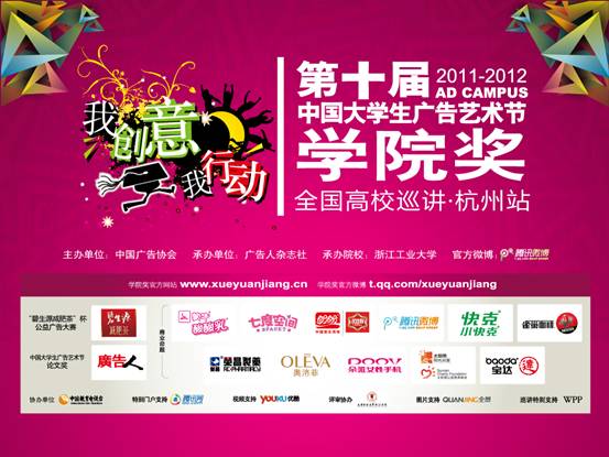 第十届(2011-2012)中国大学生广告艺术节学院奖全国巡讲杭州站将于2012年3月16日周五在浙江工业大学屏峰校区健行B二楼报告厅隆重举行公益命题碧生源;商业命题蒙牛酸酸乳、腾讯微博、快克药业、奥洛菲化妆品、宝达鞋业等多家知名企业高层亲临现场解析命题。
