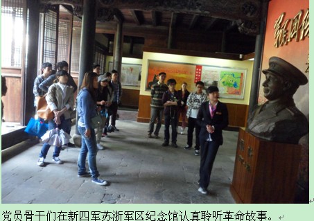 党员骨干首先怀着崇敬的心情走进新四军苏浙军区纪念馆。馆室内一件件革命文物,一张张历史照片,系统地记录了以粟裕、叶飞、王必成、江渭清等领导的苏浙军区战斗历程。在敌我力量悬殊、条件十分艰苦的情况下,抗日军民团结一心、斗智斗勇、顽强抗敌,取得了宝贵的胜利和辉煌的业绩。这些对生长在和平时期、衣食无忧、个性独特的新时期艺术学子无疑有巨大的震撼、感染和激励,使党员骨干们重新认识到肩上的重任,从而牢记历史、传承爱国情怀和铁军精神,为中华民族的崛起贡献青春和生命。