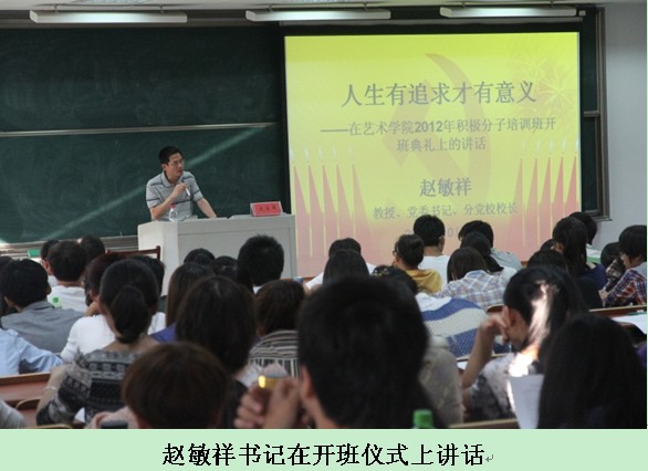 学院党委书记、分党校校长赵敏祥教授在开班仪式上作“人生有追求才有意义”的主题讲话。他肯定了艺术学院分党校历年来所取得的成绩,介绍了艺术学院党建工作的基本情况,并对学员们提出三点要求:一是要认真学习中国特色社会主义理论体系和党章,增强对党和人民的感情;二是要端正入党动机,明确行动目标和方向;三是要求大家在学习和生活中严格要求自己,充分发挥表率作用。赵书记还从科学合理地规划学习,敢于吃苦、敢于付出、敢于奉献,加强基础课程的学习,讲纪律、讲作息规律,脚踏实地、从小事做起,保持年轻人的特有的热情、激情和创劲等六个方面与大家进行了深入交流,并希望学员们抓住机遇、早日成为一名合格的共产党员。开班仪式上,培训部部长董辉对参加党校的要求和注意事项做了详细的解说。开班仪式结束后,党委组织员励立庆副教授作了“党员的条件和大学生党员的要求”的专题授课。课堂上学员们精神饱满,上课纪律和课堂秩序良好。学员们表示:将会在接下来的课程里,不断加强党的相关知识学习,坚定党的理想信念不动摇,严格按照一名党员的身份要求自己,努力提高党性修养。