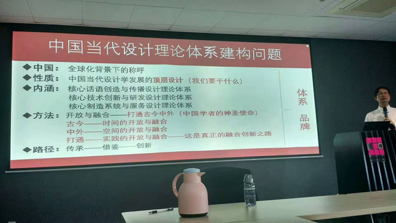 邹其昌教授的讲座内容围绕设计与设计学、经典与设计理论研究、设计理论与国家展战略、中国问题与中国设计理论建设四个方面展开,结合自己的学术经历介绍了设计学理论研究的经验及方法,并就自己多年来关于中国设计理论建构的思考与师生们进行了分享。他认为,中国当代设计理论体系构建应当是中国当代设计发展的旗帜和目标,其中包括设计理论研究、设计技术探索、设计方法探寻、设计教育创新和设计产业创构这五大版块,围绕设计理论、设计实践和设计产业三大核心进行研究,中国学者应当秉持开放融合的学术心态,古今打通、中外打通,学会传承、借鉴,并在此基础上实现技术创新、理论创新。