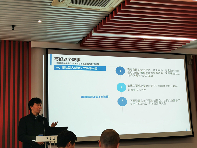 卢世主教授围绕国家社科基金艺术学项目申报思路与相关问题,从课题申报的范式、如何讲述一个好的故事、课题申报书撰写的注意事项、申报成功的课题案例等方面进行了深入剖析;并结合自身的学术经历介绍了国家社科基金艺术学项目申报的经验及方法,同时就自己多年来关于课题申报书撰写的经验和思考与师生们进行了分享。报告结束后,老师们纷纷就各自研究的课题相关内容和卢教授进行了深入的交流与探讨。