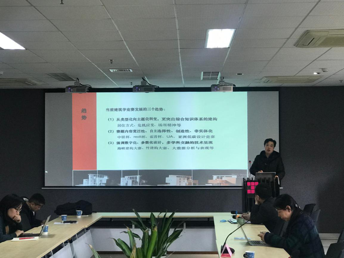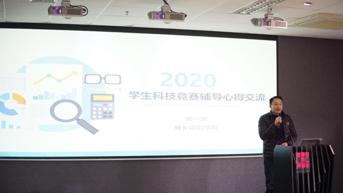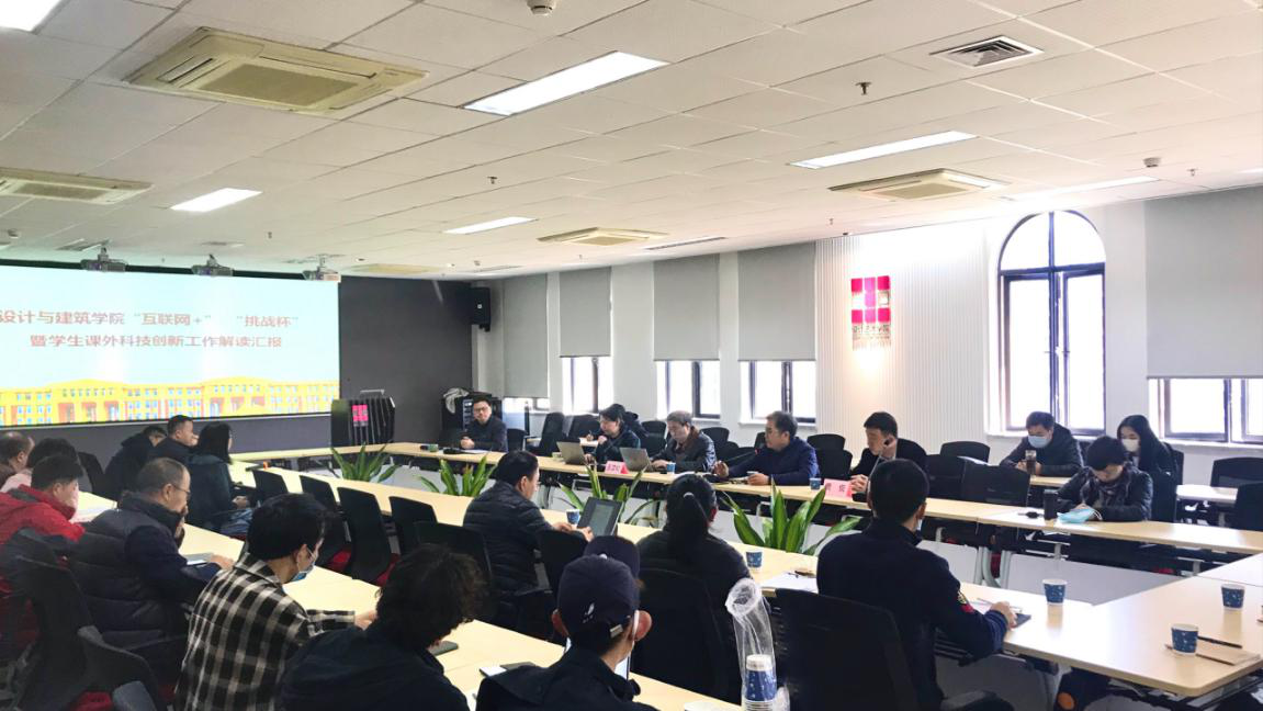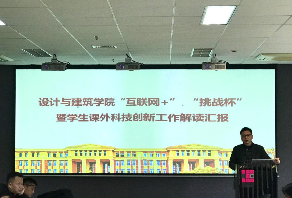 会议还对学院学生课外科技创新工作进行了简要回顾和政策解读,还组织了四位教师进行主题交流分享。在工作回顾与政策解读环节,学院党委副书记林敏喜全面介绍学院近几年学生课外科技创新工作情况,总结学院工作特点,分析学生课外科技创新项目类型和学校相关政策解析,并为下一阶段工作做了部署。在教师交流环节,组织了四位辅导学生课外科技创新活动经验丰富的教师进行主题交流分享。工业设计系黄薇老师对工业设计专业近几年学生课外科技创新工作做了精彩汇报,特别是对学生资助和激励体系构建做了重点讲解;环境设计系金阳老师从“互联网+”比赛角度阐释学生团队建设的方式方法和重要性,为今后学生团队组建树立榜样;建筑系朱晓青老师以其丰富的学生课外科技创新工作经验进行分享,让在座教师深受启发;规划系吴一洲老师围绕学生课外科技创新项目的选题、资源整合、成果营销等几个方面开展交流,深刻分析了成功项目的关键所在。