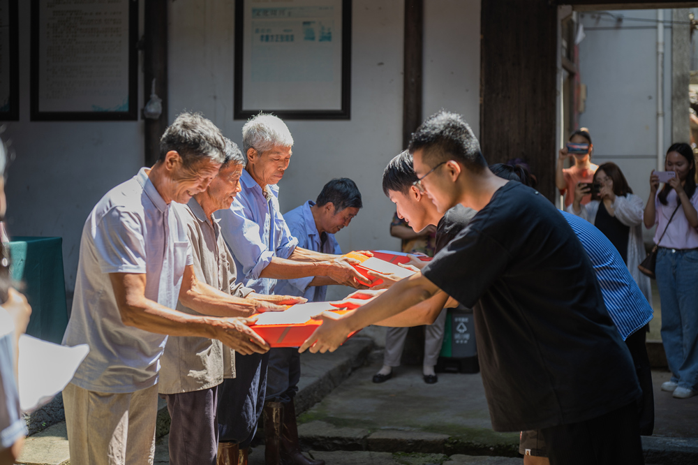 上午,“插秧节”开幕式暨拜师仪式在岭里村文化大礼堂举行,衢州市农业农村局机关工委专职副书记巫燕飞、齐溪镇镇长徐顺桃、钱江源国家公园管理局齐溪执法所所长徐谊明、岭里村书记姜福良及村两委干部与学院党员师生近50人参与活动。师生党员们向农民师傅们行礼并捧上清茶,农民师傅们带着大家走进田间,介绍岭里村特色,并教授了播种、插秧、耕田等农事知识,在实践中促进师生党员们对专业知识的理解。