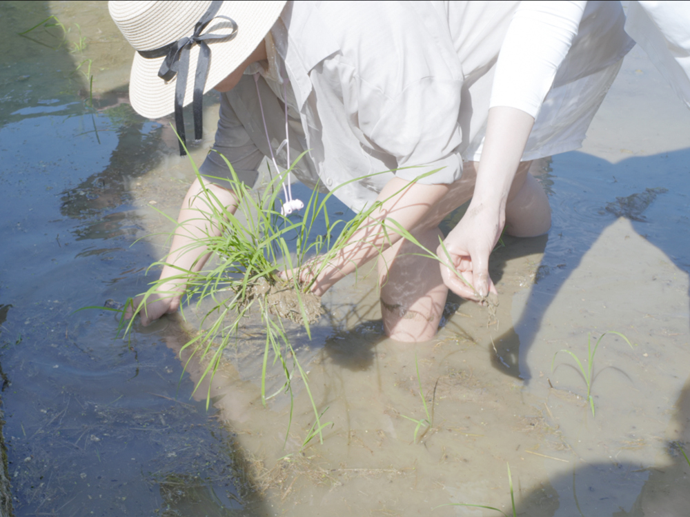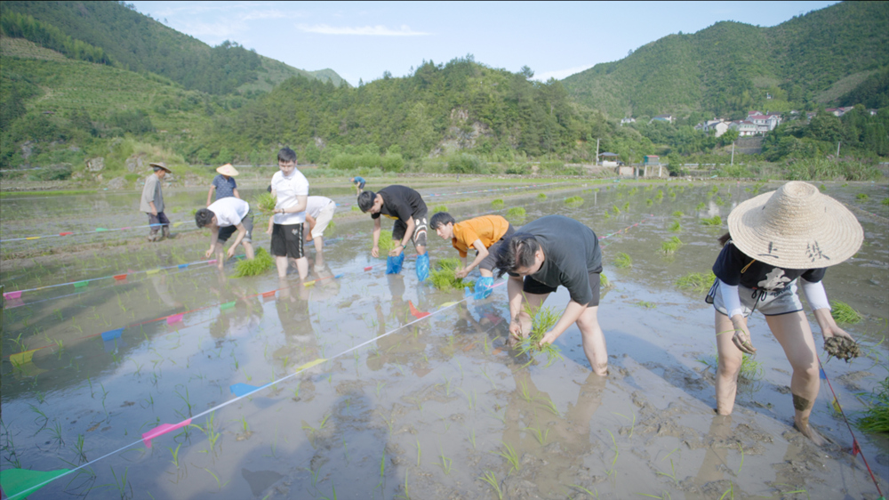 课后,师生党员们跟随农民师傅下到田间体验插秧,农民师傅们详细讲解了插秧的方法、步骤以及相关注意事项,师生党员们穿着秧水袜,在田里亲身体验插秧。烈日当头,但大家的热情不减,甚至还展开了一场激烈而有趣的插秧比赛,年轻人的活力与张力在太阳的共同作用下让岭里的田野上跃动着橙色的音符。