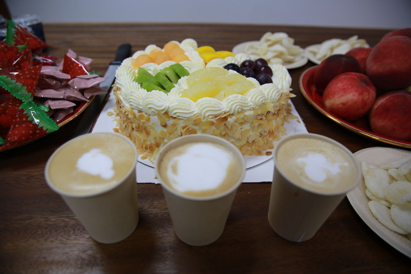 学院工会准备了精致的茶点、饮料、生日蛋糕,工会主席邵文更是从家中搬来了咖啡机,为在座的寿星们亲手制作咖啡,更为生日会增添了温馨气息。