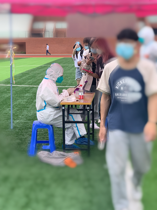 同学们在教工党员志愿者们的引导下有序进入采样区参加核酸检测,筑牢校园“防疫墙”。