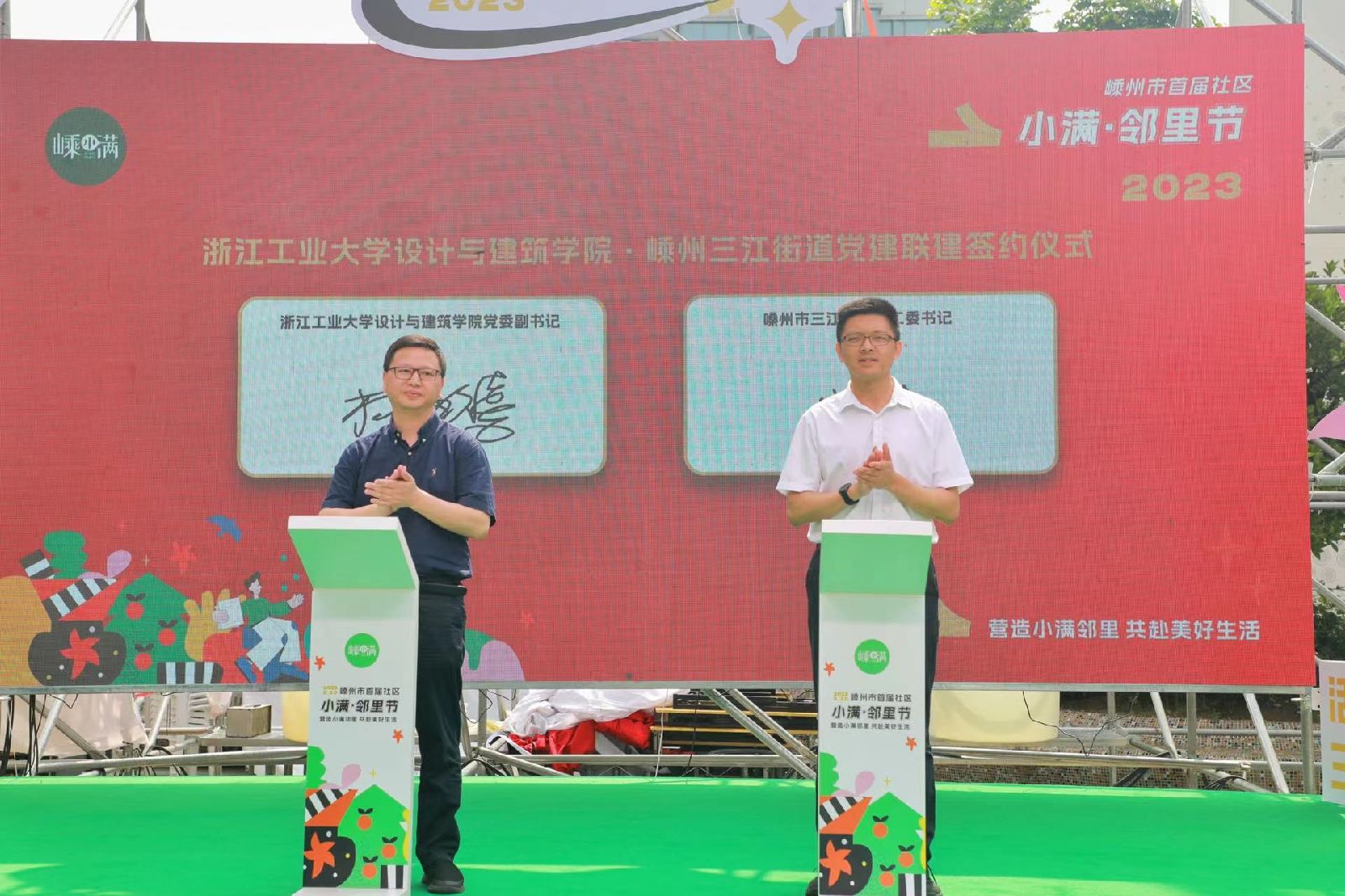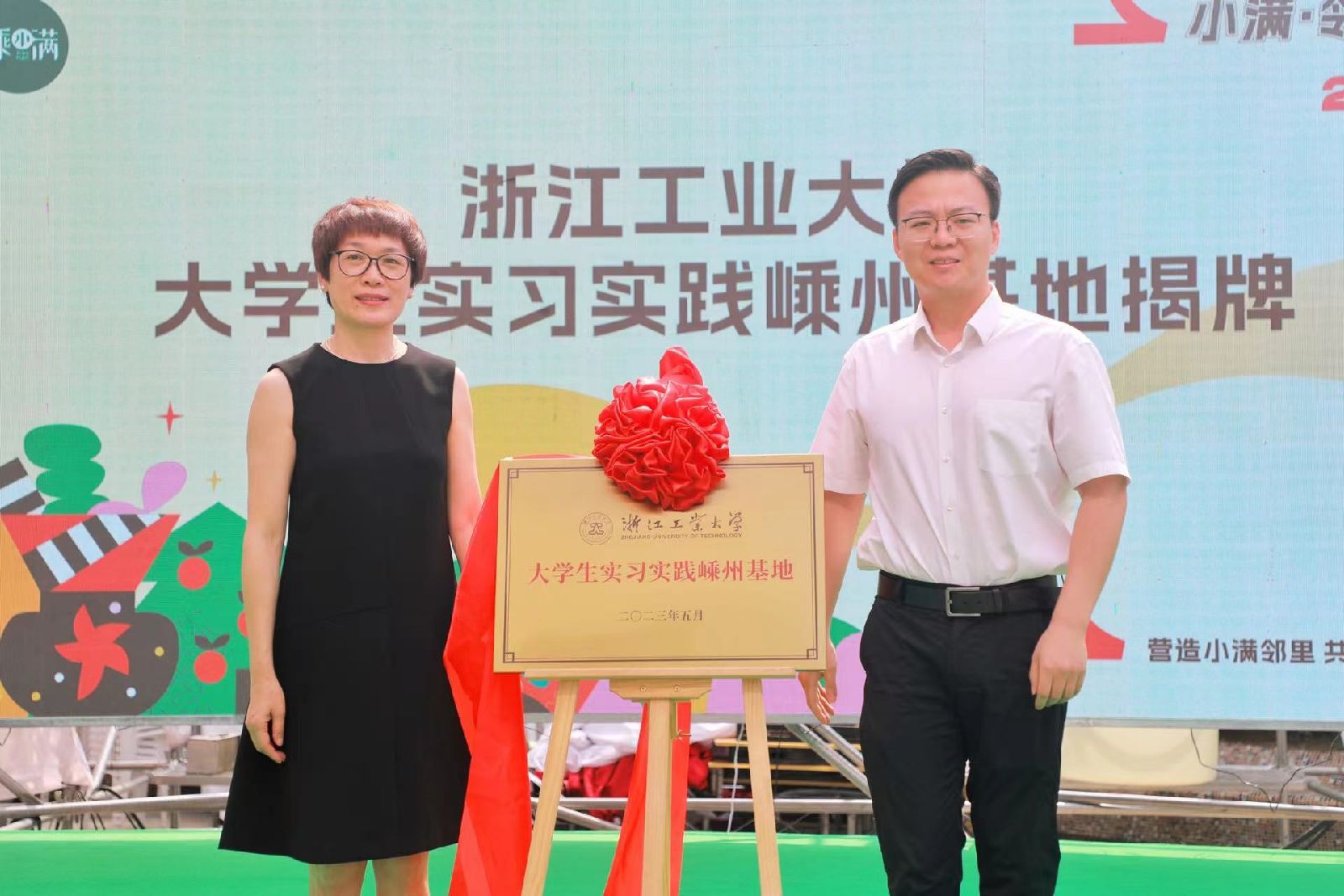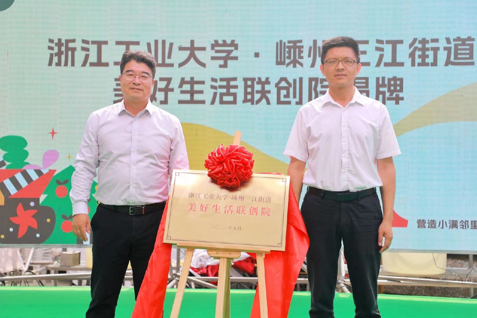 签约仪式上,还举行了浙江工业大学大学生实习实践嵊州基地揭牌仪式和浙江工业大学·三江街道美好生活联创院揭牌仪式,依托学院工设教师党支部的专业优势,以“形态、业态、文态、生态”四大创新设计路径,助推三江街道构建宜居、韧性、智慧社区。