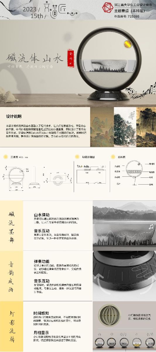 最终,彭雨璐、马欣彦、叶晨斌的《ROLLING——儿童智能跟随相机》,涂思维、石冰玉的《江语——基于钱江观潮的多感疗愈型香氛机设计》,王婧、于立、黄宇恒的《磁流体山水》,共三件作品荣获主题赛道“文道匠心”一等奖;黄乾、徐韵晗、周小莉的《FurPect 自清洁宠物挠痒玩具》荣获产业赛道“义乌小商品”一等奖;林妍曦、顾雨婕的《Car-friction儿童力学知识启蒙桌游》荣获产业赛道“儿童玩具”一等奖;彭雨璐、马欣彦、叶晨斌的《TRANSITION——多功能露营折叠桌》荣获产业赛道“永康五金”一等奖。