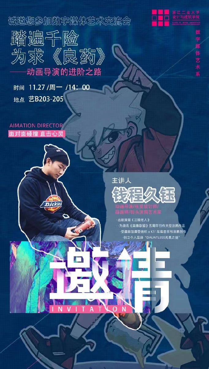 一、报告主题:踏遍千险,为求《良药》——动画导演的进阶之路 二、报告时间:2023年11月27日14:00 三、报告地点:屏峰校区艺术楼B203-205 四、主讲人:钱程久钰,动画导演、视觉设计师、插画师、街头涂鸦艺术家 出版漫画《兰陵老人》; 为腾讯《英雄联盟》五周年创作大型涂鸦作品; 受邀参加摩登地标X K11车库音乐节涂鸦创作; 创立个人品牌“Dauntless无畏之徒”。