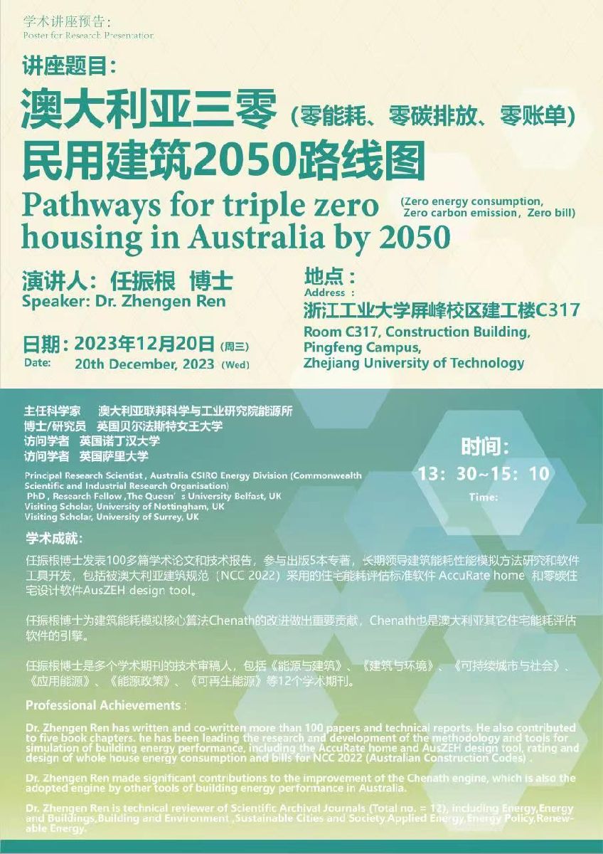 任振根博士,澳大利亚联邦科学与工业研究院能源所主任科学家,英国贝尔法斯特女王大学博士/研究员,英国诺丁汉大学访问学者,英国萨里大学访问学者。任振根博士发表100多篇学术论文和技术报告,参与出版5本专著,长期领导建筑能耗性能模拟方法研究和软件工具开发,包括被澳大利亚建筑规范 (NCC 2022)采用的住宅能耗评估标准软件 AccuRate home 和零碳住宅设计软件AusZEH design tool。任振根博士为建筑能耗模拟核心算法Chenath的改进做出重要贡献,Chenath也是澳大利亚其它住宅能耗评估软件的引擎。任振根博士是多个学术期刊的技术审稿人,包括《能源与建筑》《建筑与环境》、《可持续城市与社会》《应用能源》《能源政策》《可再生能源》等12个学术期刊。