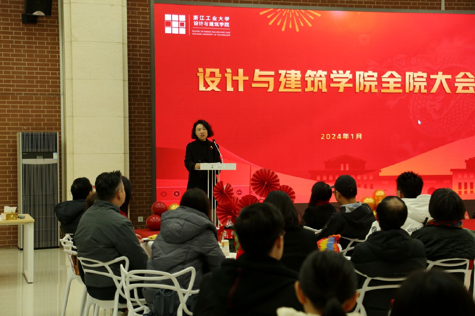 1月18日中午,学院在一楼大厅召开全院大会暨2024年新春游园会,全体教职工参会,党委书记张榄主持会议。